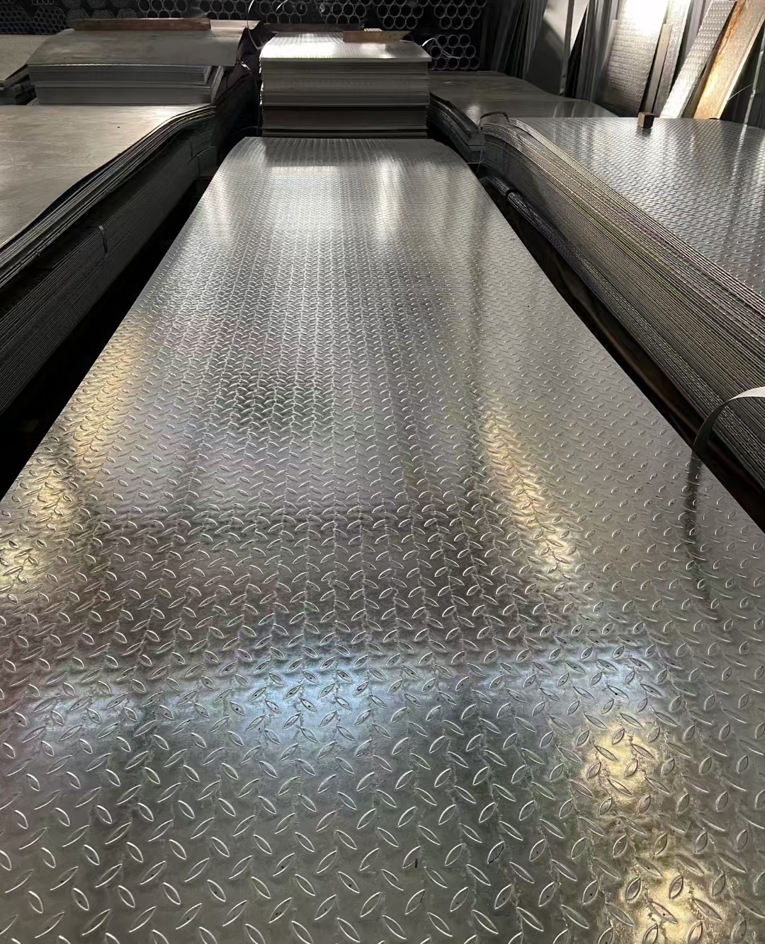 Patterned steel plates are used for pedals of workshops, large equipment or ship walkways and stairs. They are steel plates with diamond or lentil-shaped patterns pressed on the surface.